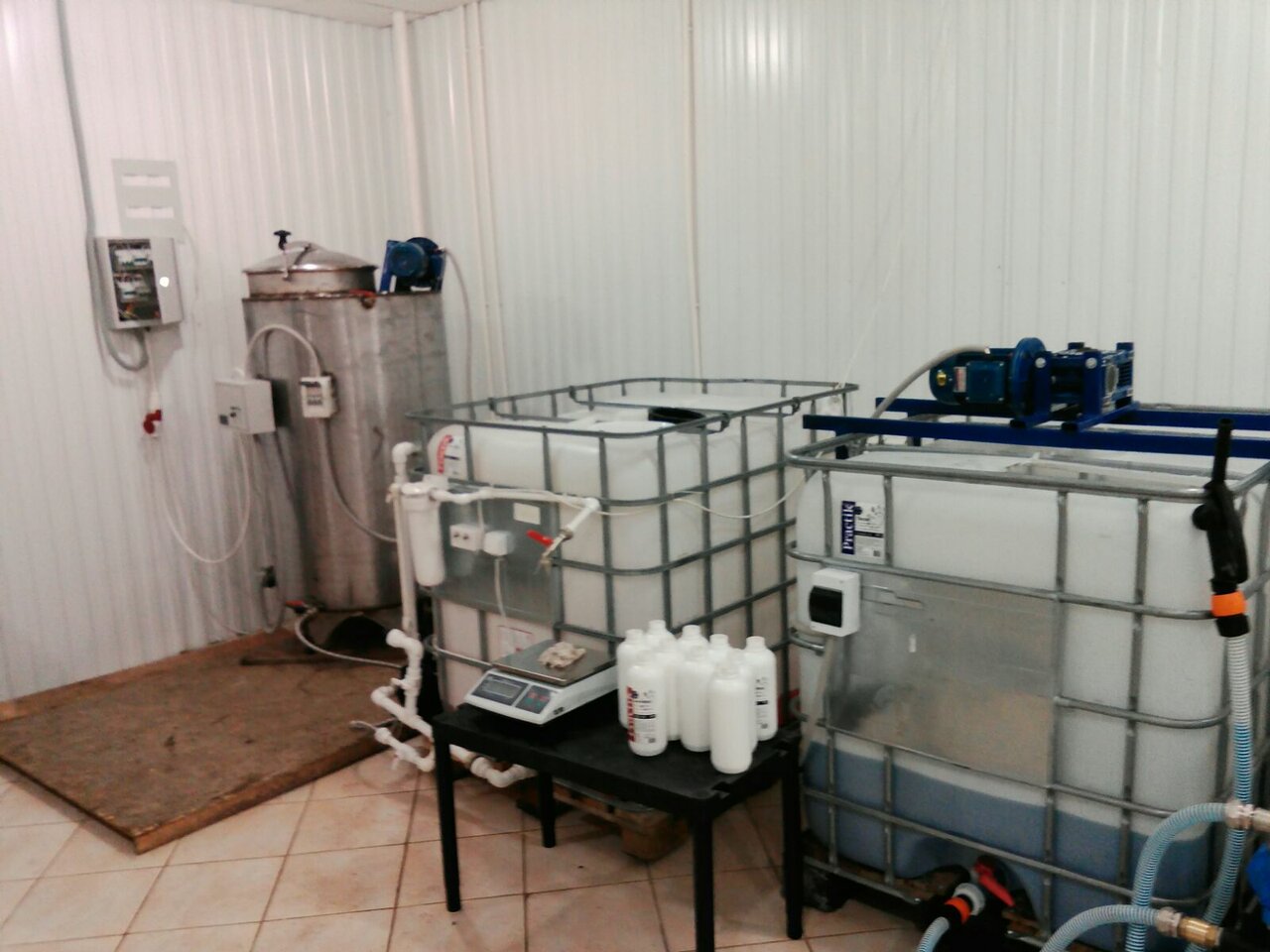 Самая оптимальная площадь цеха должна быть примерно 300 – 500 кв.м. Сама установка занимает 10 кв.м., минимальная площадь, выделенная под нее, должна быть не менее 50 кв.м. также необходима площадь для хранения пустых канистр и продуктов, из которых состоит производство. Они могут храниться и на открытой территории либо в неотапливаемом помещении. Для лучшего устройства транспортного потока, необходимо разделить складскую и производственную площадь.