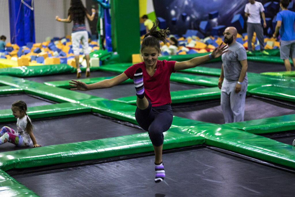 Прыжки — это развлечение в любом возрасте. В любой день AirTime Trampoline & Game Park приглашает семьи, студентов колледжей, подростков и подростков прыгать вместе друг с другом, слушая самую энергичную поп-музыку, которая поможет им подняться в настроении. «У нас люди прыгали с пяти до 85 лет, — говорит главный операционный директор Сэм Ланди.