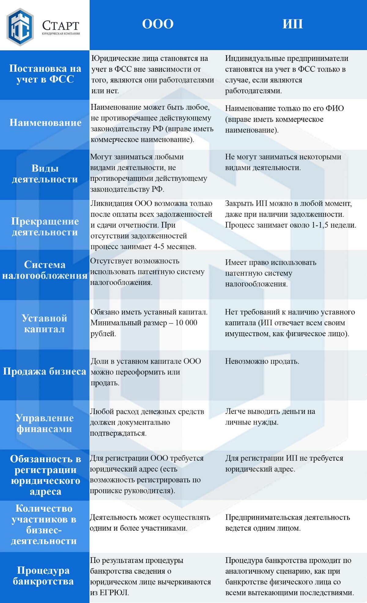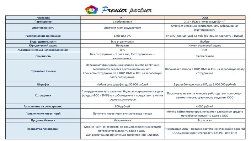 Регистрационные действия | Требует меньше затрат как на этапе регистрации, так и на этапе закрытия. Поэтому новый бизнес предпочтительнее начинать в качестве ИП. | При регистрации необходимо иметь юридический адрес, госпошлина выше в 5 раз, ликвидировать ООО долго и трудоемко. |