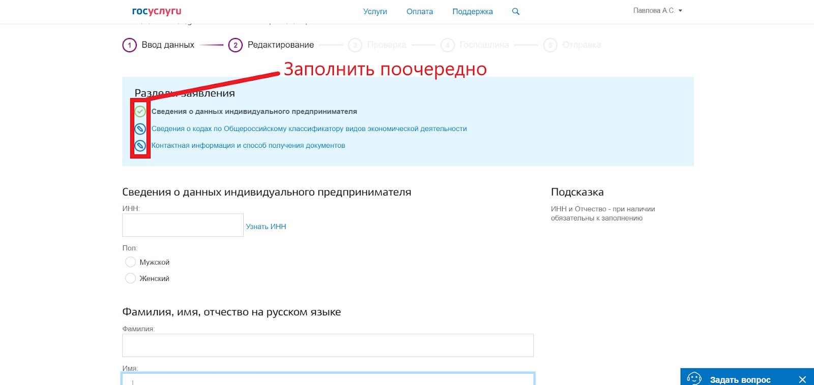 2. Заполнение заявления на добавление кодов ОКВЭД для ИП