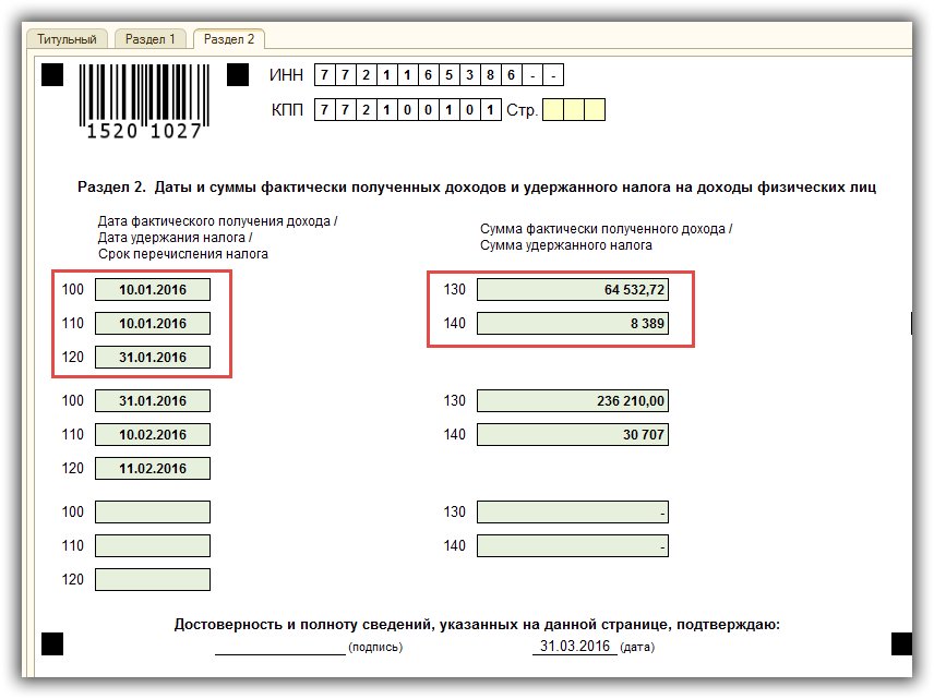 8). Дата удержания налога (дата для строки 110) это также дата, которая указана в поле Дата выплаты. Срок перечисления удержанного налога (дата для строки 120) – не позднее последнего числа месяца, в котором производились такие выплаты.