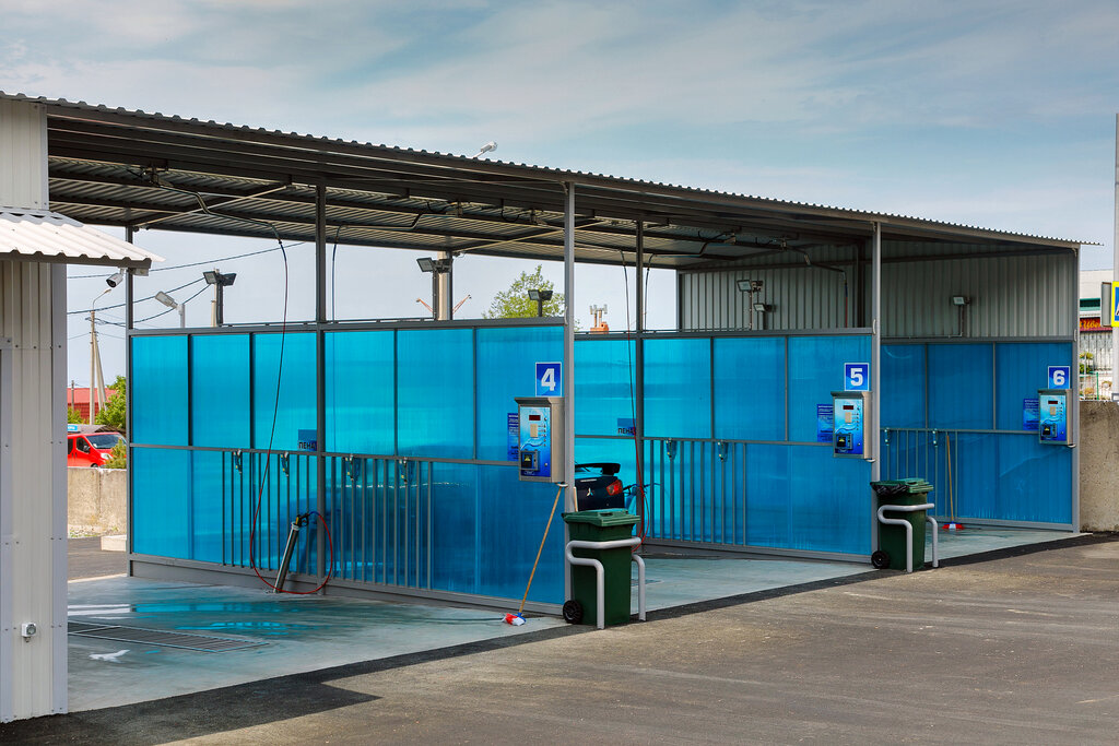 Самый популярный в Европе тип мойки и набирающий популярность в России – это открытая мойка самообслуживания. Представляет собой навес из металлоконструкций, обеспечивающий сквозной проезд автомобиля. Обеспечивает максимальную проходимость постов.