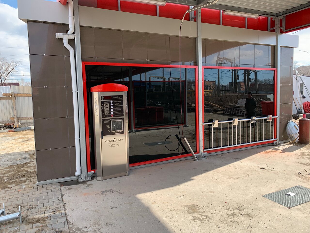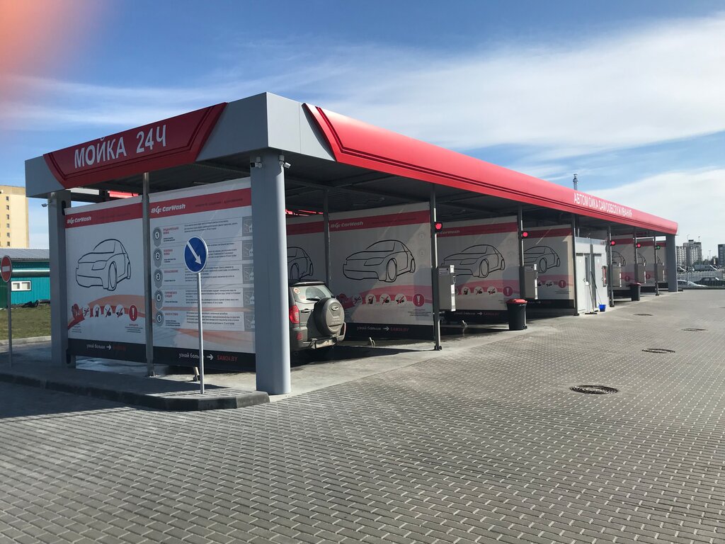 Простая и привлекательная конструкция, выполненная в бело-голубых тонах, силовое оборудование сосредоточено в техническо помещении — контейнере. Автомойка на шесть постов способна справиться с потоком клиентов, достигающих количества 300 автомобилей/сутки.