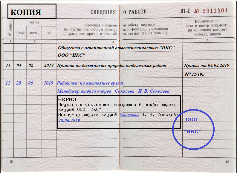 Рядом с последней записью в трудовой книжке делается отметка о том, что сотрудник продолжает работать в данной организации. Указанная отметка подтверждается печатью предприятия, если ее наличие предусмотрено уставом компании (с 2015 года печати стали необязательными). Также по ГОСТу необходимо сделать запись о месте хранения оригинала трудовой книжки и копии.Срок действия заверенной копии трудовой книжки