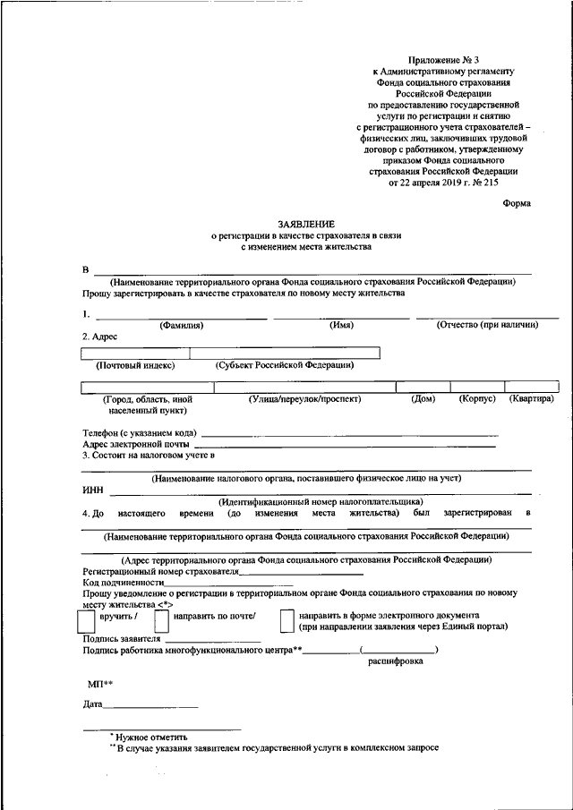 - Заявление о регистрации в качестве страхователя-физ. лица по форме, утвержденной Приказом ФСС РФ от 22 апреля 2019 г. № 215,