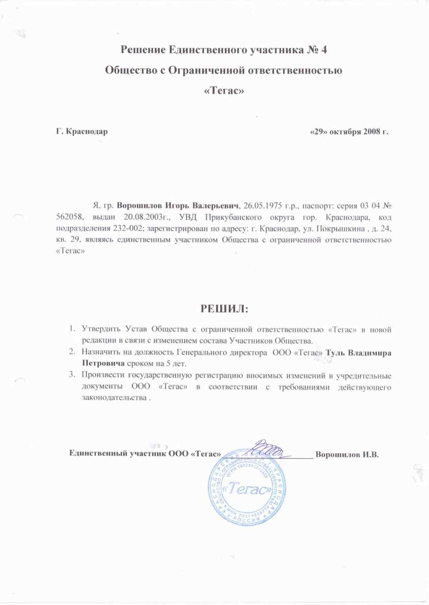 Ниже приведен пример решения, принятого единственным учредителем общества. Если в вашем случае участников ООО несколько, в документ нужно внести информацию о каждом из них.