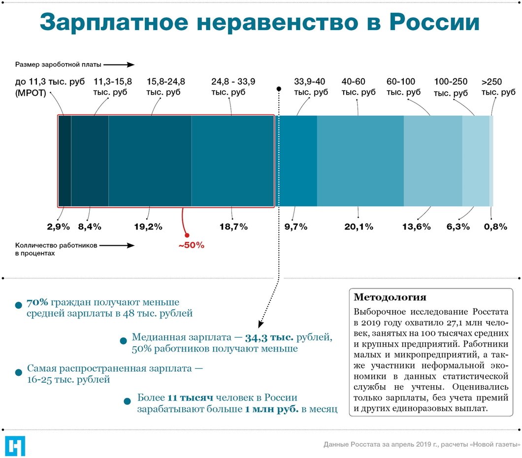 По данным Росстата, в 2019 году медианная зарплата составляла около ₽34,3 тыс. в месяц. Это значит, что 50% россиян зарабатывали больше этой суммы, а зарплата еще половины была меньше. Причем получилась она на основе данных крупных и средних предприятий, без малого бизнеса. По предварительным расчетам этого года, медианная зарплата составляет почти ₽30,5 тыс. В этот раз Росстат взял информацию из Пенсионного фонда страны.