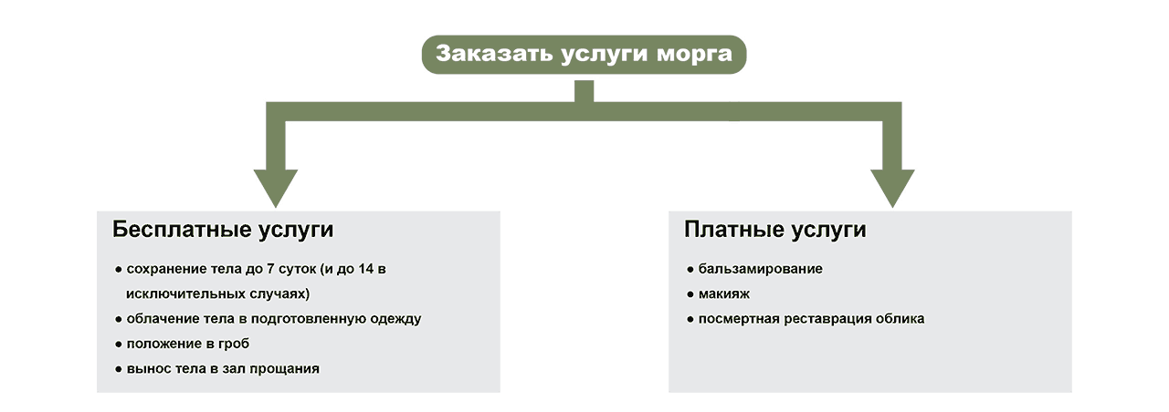 Бесплатные услуги в морге регламентируются ФЗ-8 «О погребении и похоронном деле». В их число входит: