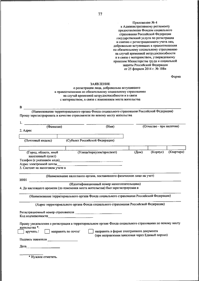 12.2009 N 959н (ред. от 07.10.2011) «О порядке регистрации и снятия с регистрационного учета страхователей и лиц, приравненных к страхователям, Приказ Минтруда России от 25.02.2014 N 108н «Об утверждении Административного регламента предоставления Фондом социального страхования Российской Федерации государственной услуги по регистрации и снятию с регистрационного учета лиц, добровольно вступивших в правоотношения по обязательному социальному страхованию на случай временной нетрудоспособности и в связи с материнством»).Регистрация и снятие с регистрационного учета страхователей