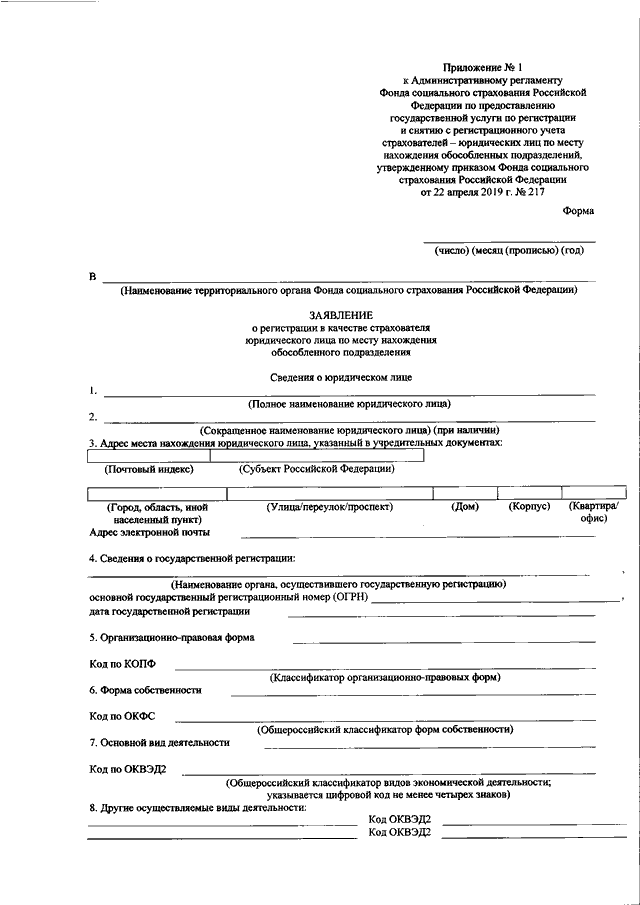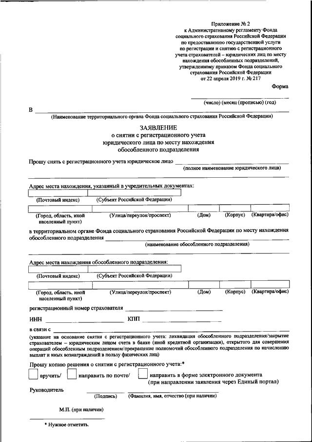 Вам потребуется Форма — Приложение № 2 к Административному регламенту Фонда социального страхования Российской Федерации по предоставлению государственной услуги по регистрации и снятию с регистрационного учета страхователей – физических лиц, заключивших трудовой договор с работником, утвержденному приказом Фонда социального страхования Российской Федерации от 22 апреля 2019 г. № 215.
