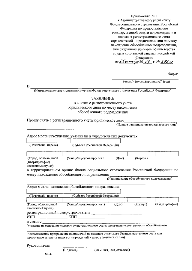- Бланк заявления о снятии ИП с учета в ФСС (регламент №574).