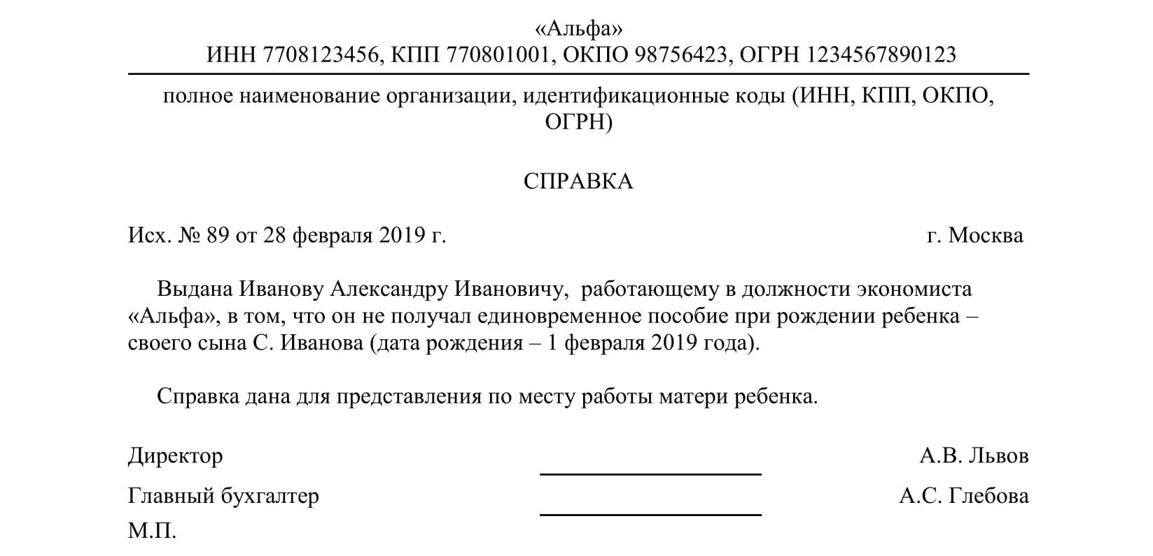 При оформлении пособия по уходу за ребенком потребуется справка от второго родителя, что он не получает аналогичную компенсацию на своей работе. |