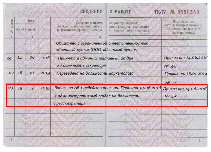 - Внесите правильную запись. В графе 4 повторите дату и номер приказа старой (неправильной) записи или нового распоряжения, на основании которого внесли правильную запись.