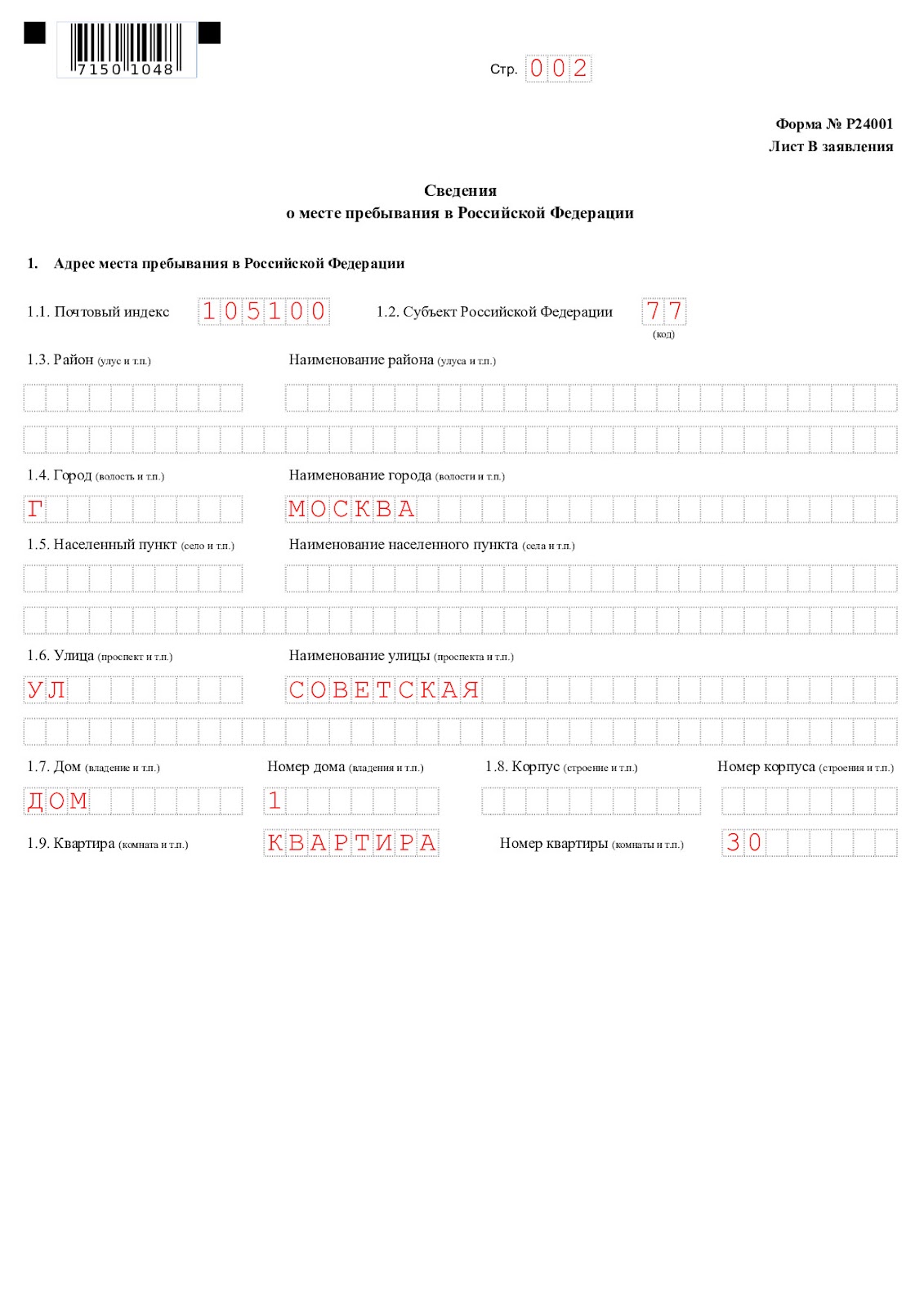 - Образец заполнения формы P24001 при изменении места проживания иностранного гражданина