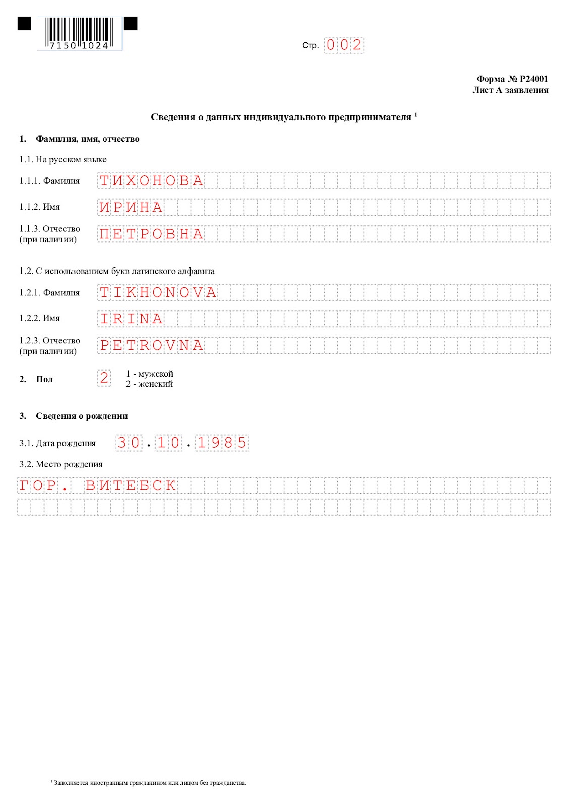 - Образец заполнения формы P24001 при изменении паспортных данных ИП-иностранного гражданина или лица без гражданства